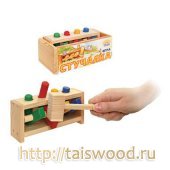 В корпусе игрушки закреплена ось, на которой установлены четыре рычага. Четыре летающих цилиндрика вставленные в отверстия в корпусе опираются на один конец рычага. Ребенок деревянным молотком ударяет по другому концу рычага и цилиндрик взлетает вверх. При этом ребенок другой рукой должен поймать цилиндрик. Игрушка развивает у ребенка координацию движений, сноровку и ловкость.