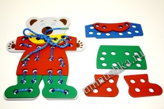 Эта отличная деревянная шнуровка включает очаровательного медведя, тринадцать предметов одежды и аксессуаров и длинный шнурок Развивает моторные навыки и творческие задатки!