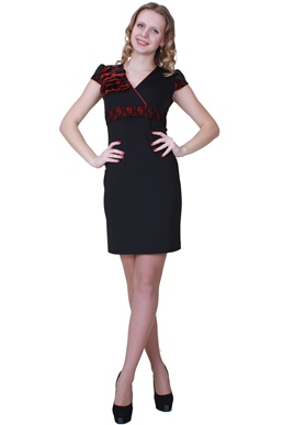 "Платье из плотного сильно-стрейчевого трикотажного полотна, хорошо скрываюшего недостатки фигуры, со вставками из атласа и гипюра.