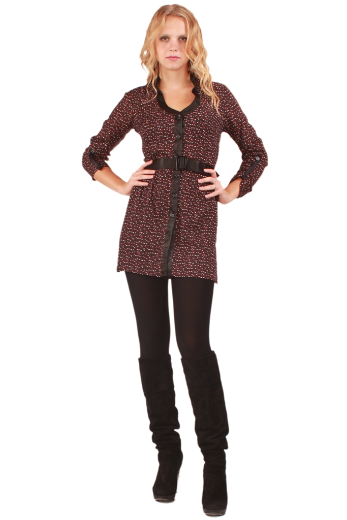 "Длинная туника-рубашка из набивного штапеля. Планки, пояс и паты рукавов из ткани, имитирующей кожу.