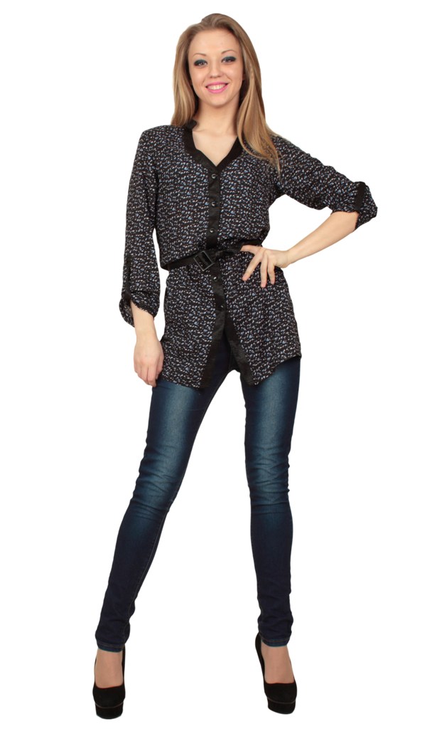 "Длинная туника-рубашка из набивного штапеля. Планки, пояс и паты рукавов из ткани, имитирующей кожу.