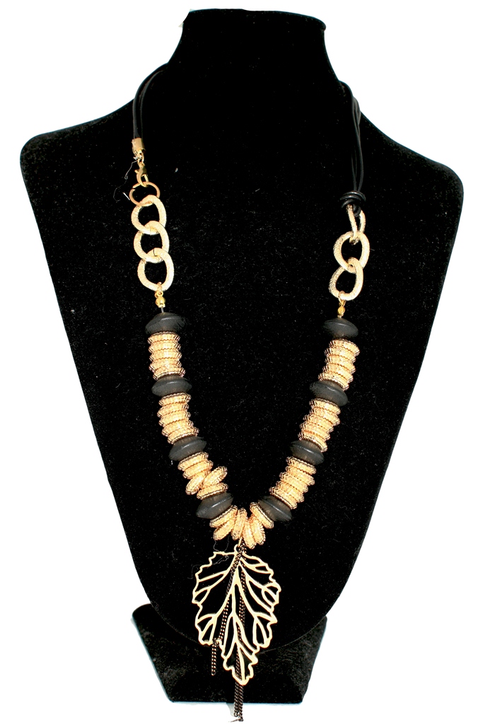 Колье из металла и дерева на шнуре из кожезаменителя.